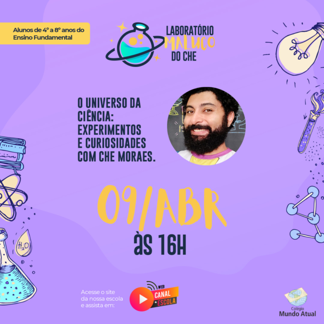 Um evento especial para os alunos do 4º ao 8º ano, o Laboratório Maluco do Che. É um programa inusitado sobre o universo da ciência, cheio de experimentos e curiosidades.
