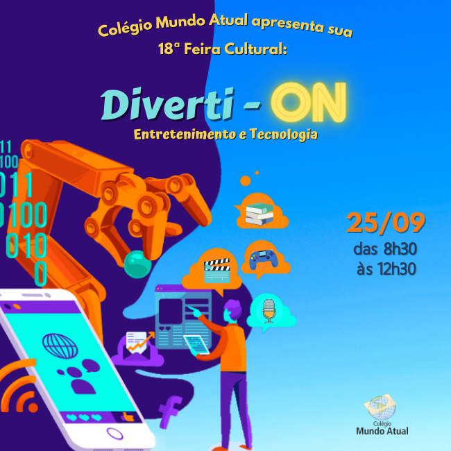 O Colégio Mundo Atual orgulhosamente apresenta, a sua 18ª Feira Cultural, com o tema "Diverti-ON - Entretenimento e Tecnologia"! ?? Estamos preparando uma manhã incrível, nesse sábado (25/09), das 8h30 às 12h30! Temas das turmas: Confira relatos dos professores sobre como foi no post do blog: TBT 18ª Feira Cultural